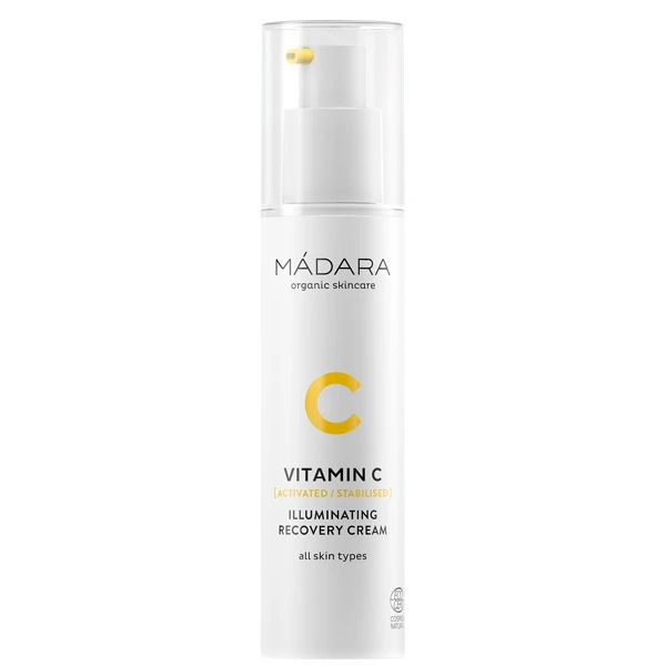 Vitamin C Illuminating Recovery Cream de la marque Madara illumine instantanément les peaux ternes et fatiguées, pour un teint plus uniforme.