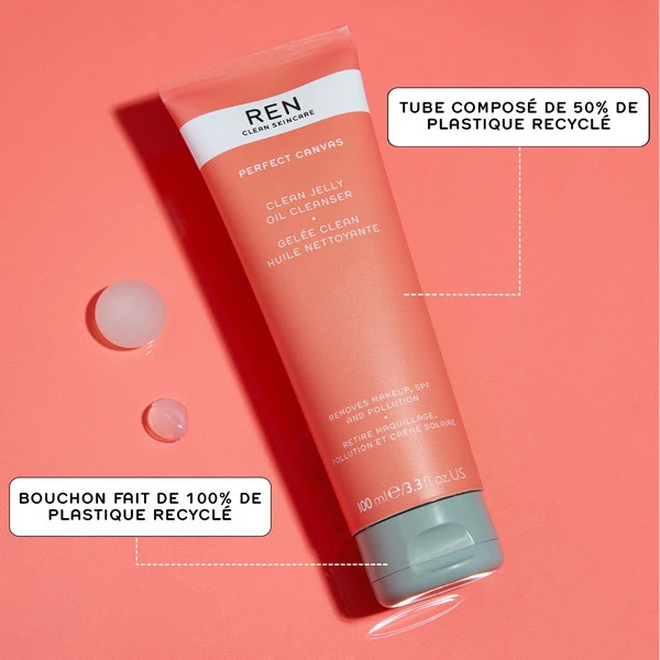 Le plus : son emballage écologique. Le tube de la gelée nettoyante REN est composé de 50% de plastique recyclé et le bouchon est fait de 100% de plastique recyclé.